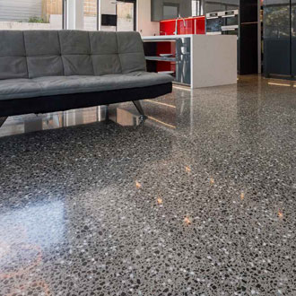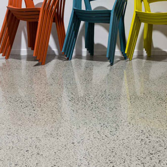 URBAN is the most traditional diamond polished finish combining cost effectiveness with an excellent random stone exposure. It requires the removal of the 2-3mm of the concrete laitance to reveal the underlying aggregates. The floor is ground flat leaving a random mix of medium stone and fine aggregates that are then polished with resin diamonds.